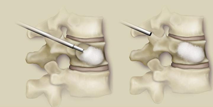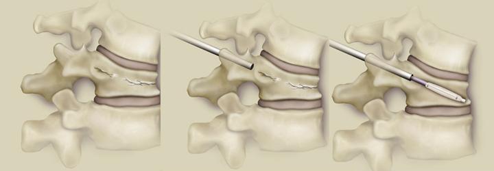 ΠΕΡΙΓΡΑΦΗ ΤΕΧΝΙΚΗΣ: Η επέμβαση συνιστάται στην έγχυση ειδικού τσιμέντου, μέσα από μικρές κάνουλες που μπαίνουν διαδερμικά. Για το σκοπό αυτό απαιτούνται μία ή δύο τομές της τάξεως του μισού εκατοστού. Η τεχνική παριστάνεται σχηματικά παρακάτω: αρχικά βλέπουμε τον "καθισμένο" σπόνδυλο που έχει υποστεί κάταγμα. Στη μέση φαίνεται η εισαγωγή της κάνουλας και στη δεξιά η εισαγωγή του μπαλονιού: