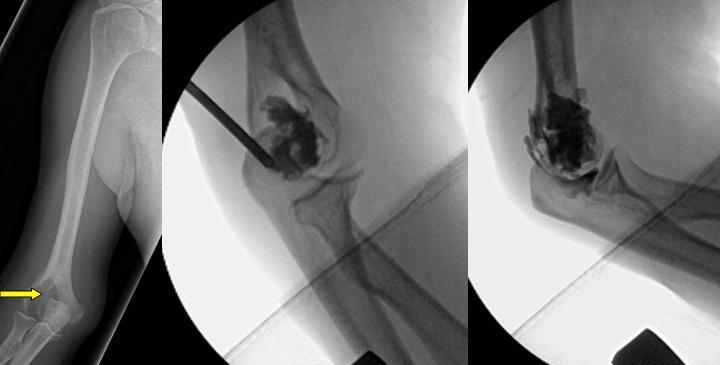 - Tέλος όπως προαναφέρθηκε μπορεί να εφαρμοστεί σε όλο το εύρος της σπονδυλικής στήλης από τον αυχένα έως το ιερό, αλλά και σε πολλά άλλα μέρη του σώματος όπου έχουν παρουσιαστεί μεταστατικές εστίες εφόσον η τεχνική γίνει οικεία (τσιμεντοπλαστική). Παραθέτουμε ένα παράδειγμα τσιμεντοπλαστικής σε ασθενή με μετάσταση στον αγκώνα (κίτρινο βέλος). Στη μέση φαίνεται η διεγχειρητική έγχυση τσιμέντου και δεξιά η τελική εικόνα: