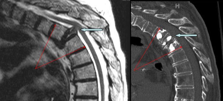 Παρακάτω απεικονίζεται ασθενής με κάταγμα ανώτερης θωρακικής μοίρας με επέκταση στο σπονδυλικό κανάλι. Με γαλάζιο βέλος φαίνεται το κάταγμα που προβάλλει μέσα στο κανάλι (αριστερά), ενώ δεξιά φαίνεται η ανάταξη του κατάγματος και της γωνίωσης (κύφωση) της σπονδυλικής στήλης (σύγκρινε τις κόκκινες γωνίες πριν και μετά την επέμβαση), μετά τη διενέργεια κυφοπλαστικής σε 3 σπονδύλους (τόσο στον υπερκείμενο, όσο και στον υποκείμενο).
