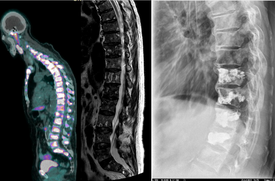 Εδώ παραθέτουμε αριστερά το PET scan που δείχνει και την κυφωτική στάση του ασθενούς, στην μέση την μαγνητική με τα πολλαπλά κατάγματα ιδίως στην θωρακοσφυικη μοίρα και την ακτινογραφία 6 μήνες μτχ.