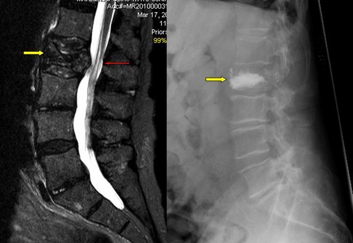 - Στον επόμενο ασθενή με κάταγμα στην οσφύ και σπονδυλική συμπίεση, έγινε στην ίδια επέμβαση κυφοπλαστική και αποσυμπίεση του σπονδυλικού σωλήνα (πεταλεκτομή) χωρίς να χρειαστεί η τοποθέτηση υλικών σπονδυλοδεσίας (ράβδοι/ βίδες). Με κίτρινα βέλη απεικονίζεται το κάταγμα (προ και μετά την επέμβαση) ενώ με κόκκινο η σπονδυλική συμπίεση, όπου έγινε και η πεταλεκτομή (αποσυμπίεση):