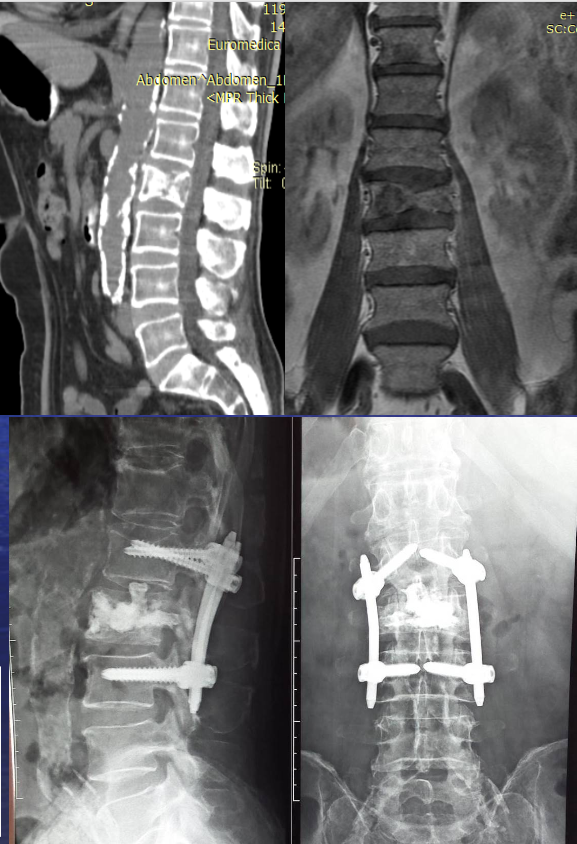 - Ενώ στον επόμενο ασθενή λόγω μεγάλης οστικής καταστροφής/ αστάθειας του Ο2 σπονδύλου έγινε και διαδερμική τοποθέτηση βιδών (ελάχιστα επεμβατική σπονδυλοδεσία): πάνω φαίνεται η αξονική και μαγνητική του ασθενούς και κάτω οι ακτινογραφίες. Αξίζει να σημειωθεί εδώ ότι λόγω της βαριάς κατάστασης του ασθενούς που δεν επέτρεπε την διενέργεια της επέμβασης με ολική αναισθησία ως συνήθως, αυτή έγινε με τοπική νάρκωση και επισκληρίδιο αναισθησία και δημοσιεύθηκε στο παρακάτω άρθρο: https://pmc.ncbi.nlm.nih.gov/articles/PMC8022040/