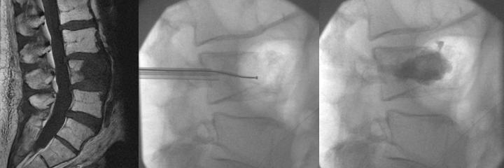 - Τέλος μπορεί να συνδυαστεί και με άλλες σύγχρονες τεχνικές όπως η θερμοκαυτηρίαση του όγκου με ραδιοσυχνότητες (radiofrequency ablation). Στις εικόνες φαίνεται η είσοδος του ειδικού probe των ραδιοσυχνοτήτων μέσα από την κάνουλα και η καυτηρίαση του όγκου (μεσαία εικόνα) και ακολουθεί η έγχυση τσιμέντου (δεξιά):